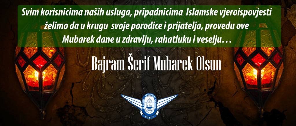 Povodom najvećeg muslimanskog praznika, Ramazanskog Bajrama, DD Gradski i prigradski saobraćaj Tuzla svim građanima islamske vjeroispovjesti, svojim putnicima i uposlenicima upućuje najiskrenije čestitke uz nadu da praznike dočekaju i provedu u društvu svojih najdražih.