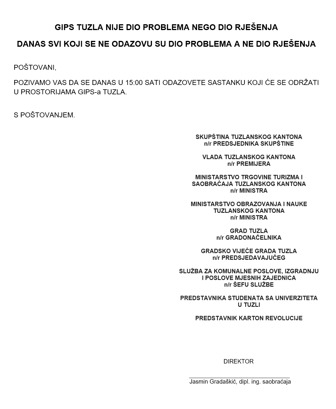 Danas smo na adresu predsjednika Skuptšine TK, Premijera Tuzlanskog kantona, Ministra trgovine, turizma i saobraćaja u Vladi TK, Ministra obrazovanja i nauke Tuzlanskog kantona, Gradonačelnika Tuzle, Predsjedavajućeg Gradskog vijeća Tuzla, Šefu službe za komunalne poslove, izgradnju i poslove mjesnih zajednica, predstavniku studenata sa UNTZ i predstavniku Karton revolucije uputili poziv da se danas u 15 sati odazovu sastanku koji će se održati u prostorijama GIPS d.o.o. Tuzla.